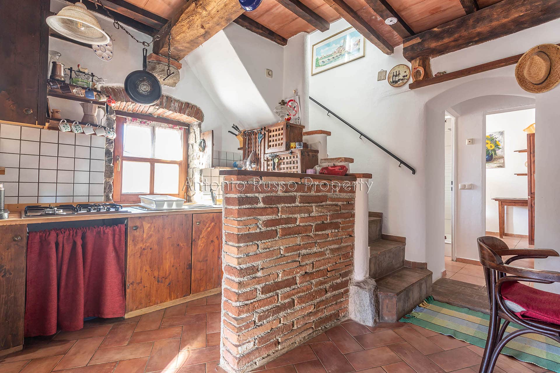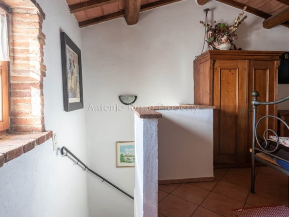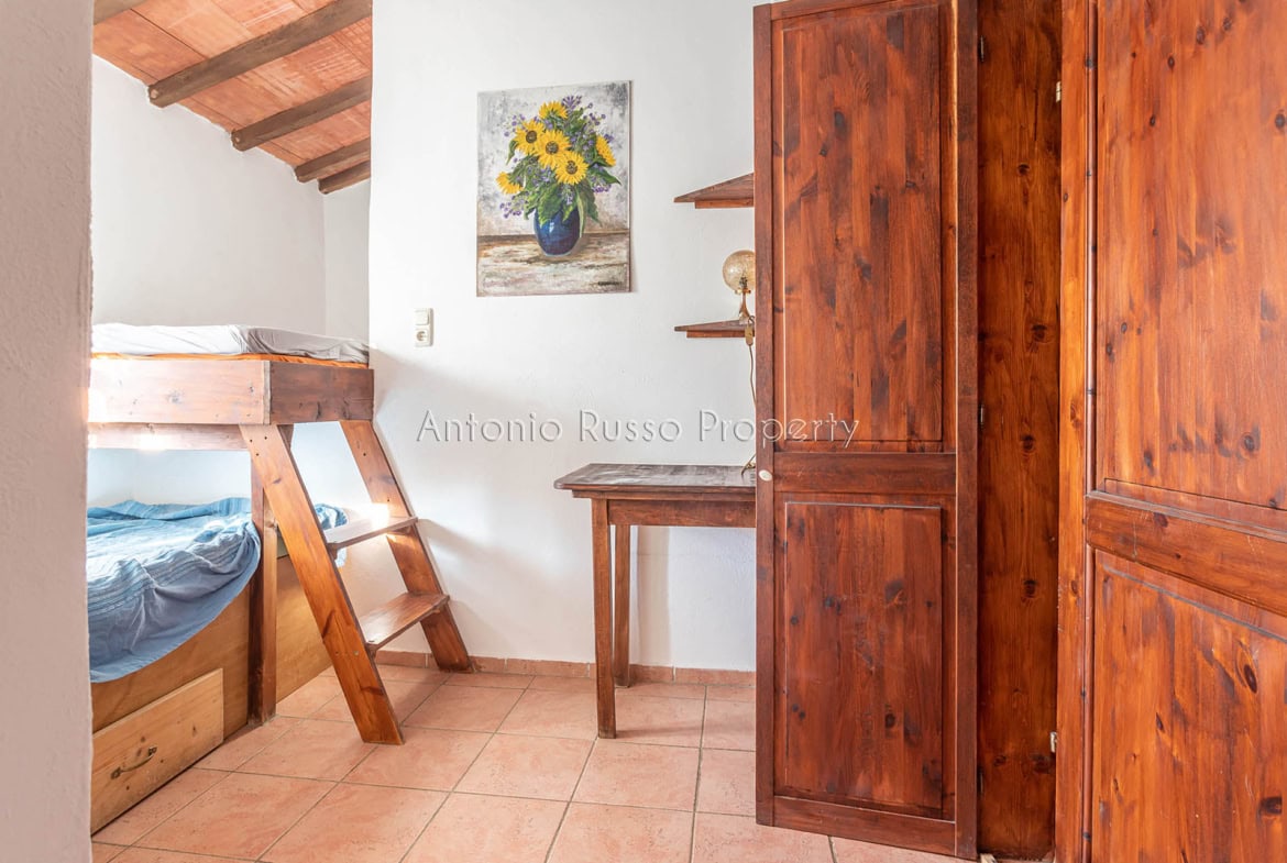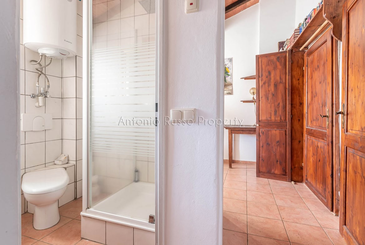 The main entrance is on the ground floor, through a bright veranda. Here we find the living area with open-plan kitchen, three rooms that can be used as bedrooms or studies, and two bathrooms. A stone staircase leads to a bedroom on the upper floor with private bathroom, perfect as a suite.