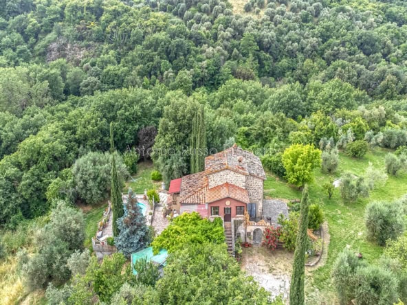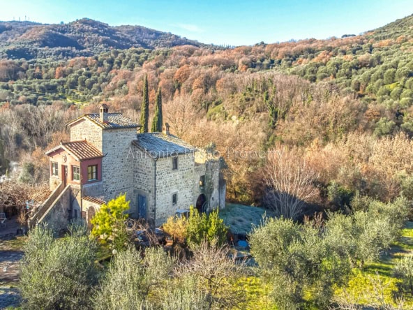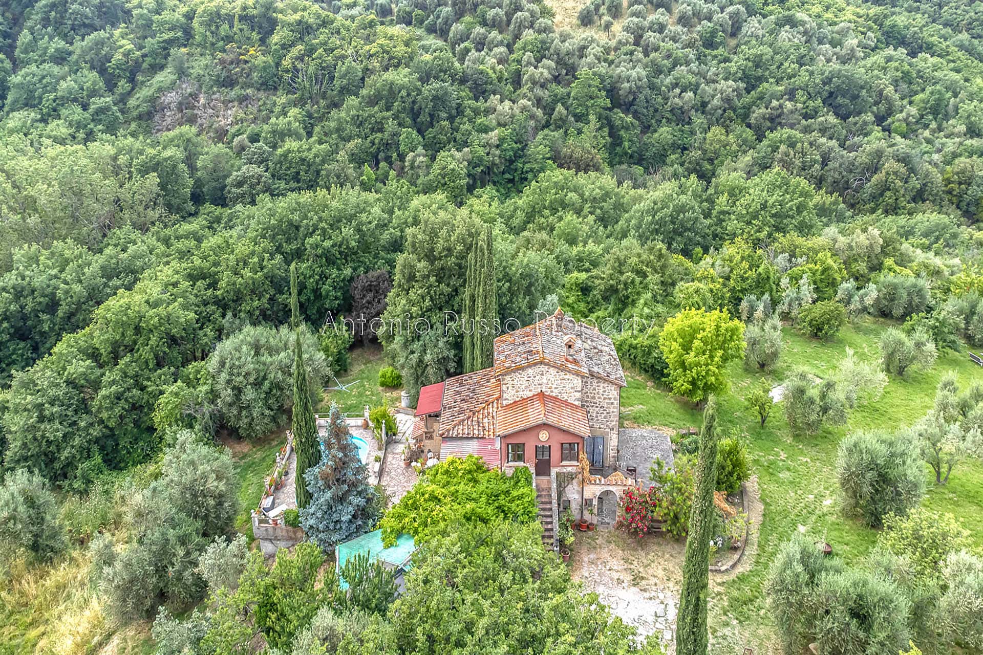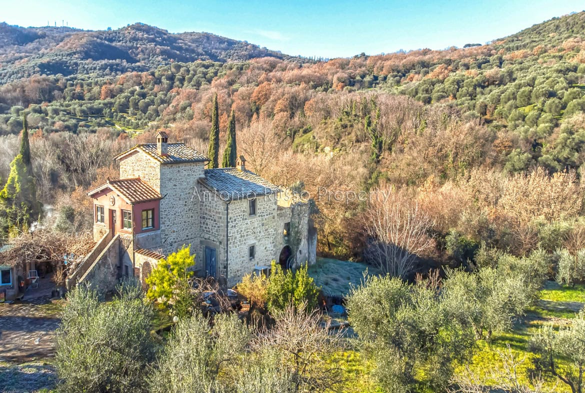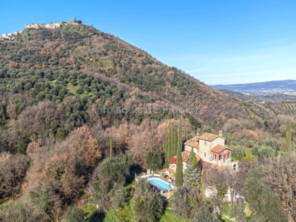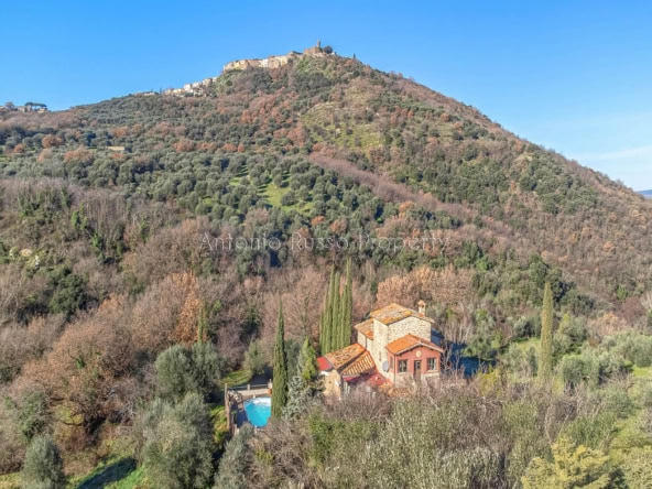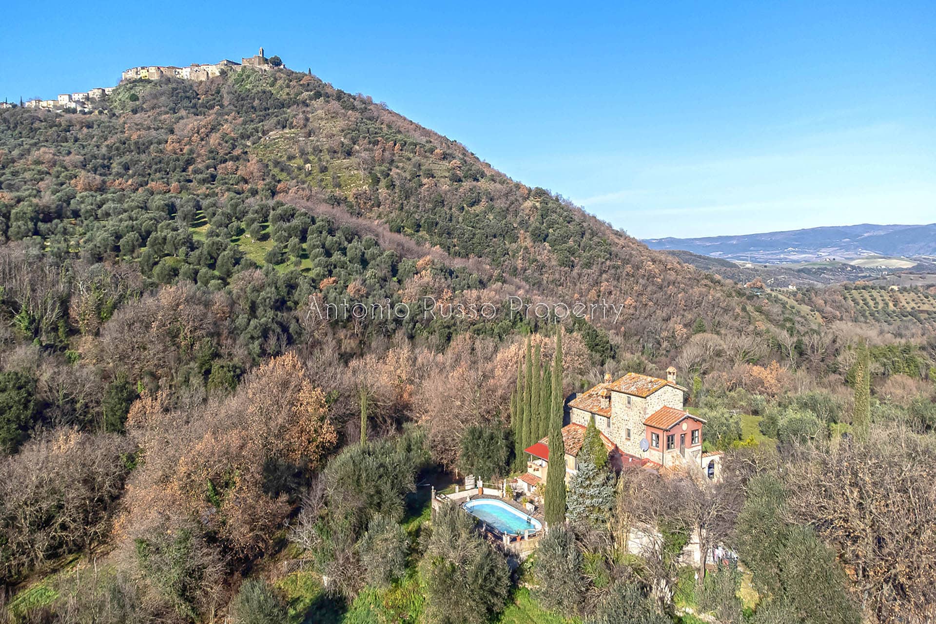 Just 3 km north of Castel del Piano, nestled in a landscape of centuries-old olive trees, this authentic Tuscan stone farmhouse offers unobstructed views of the hilltop village of Montegiovi. The property includes approximately 2 hectares of land and a rare sense of privacy, ideal for those seeking tranquility, nature, and outdoor living spaces.