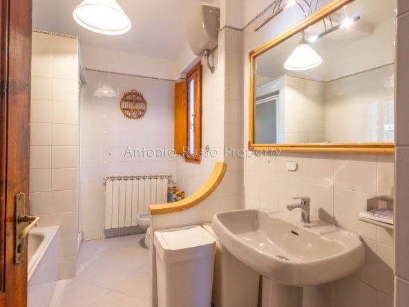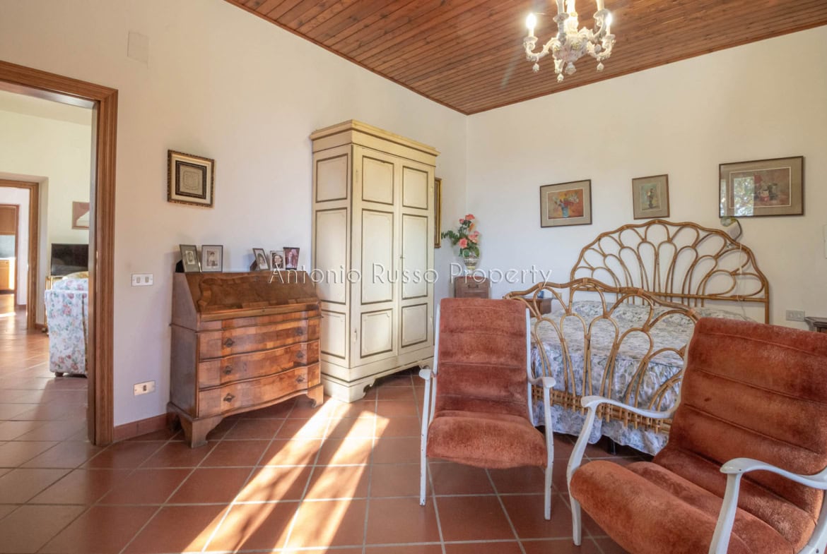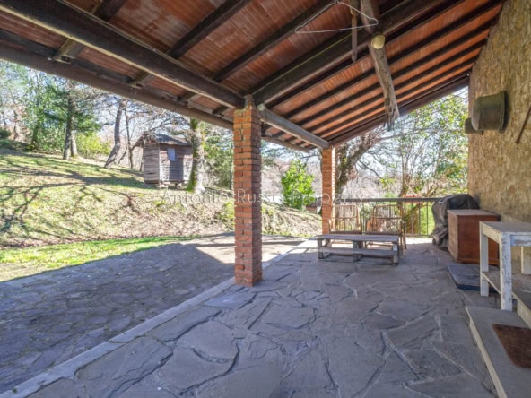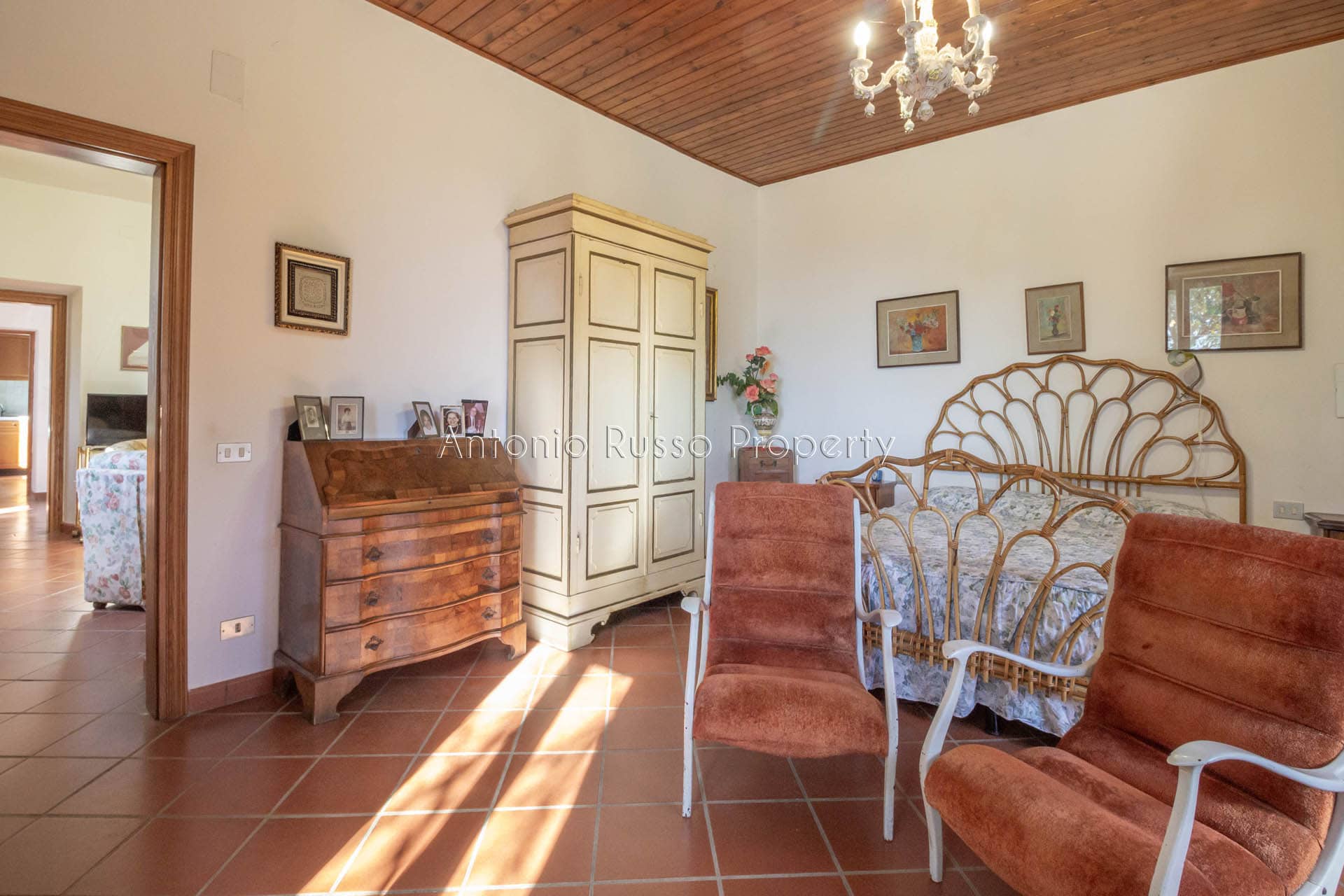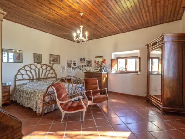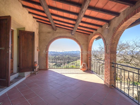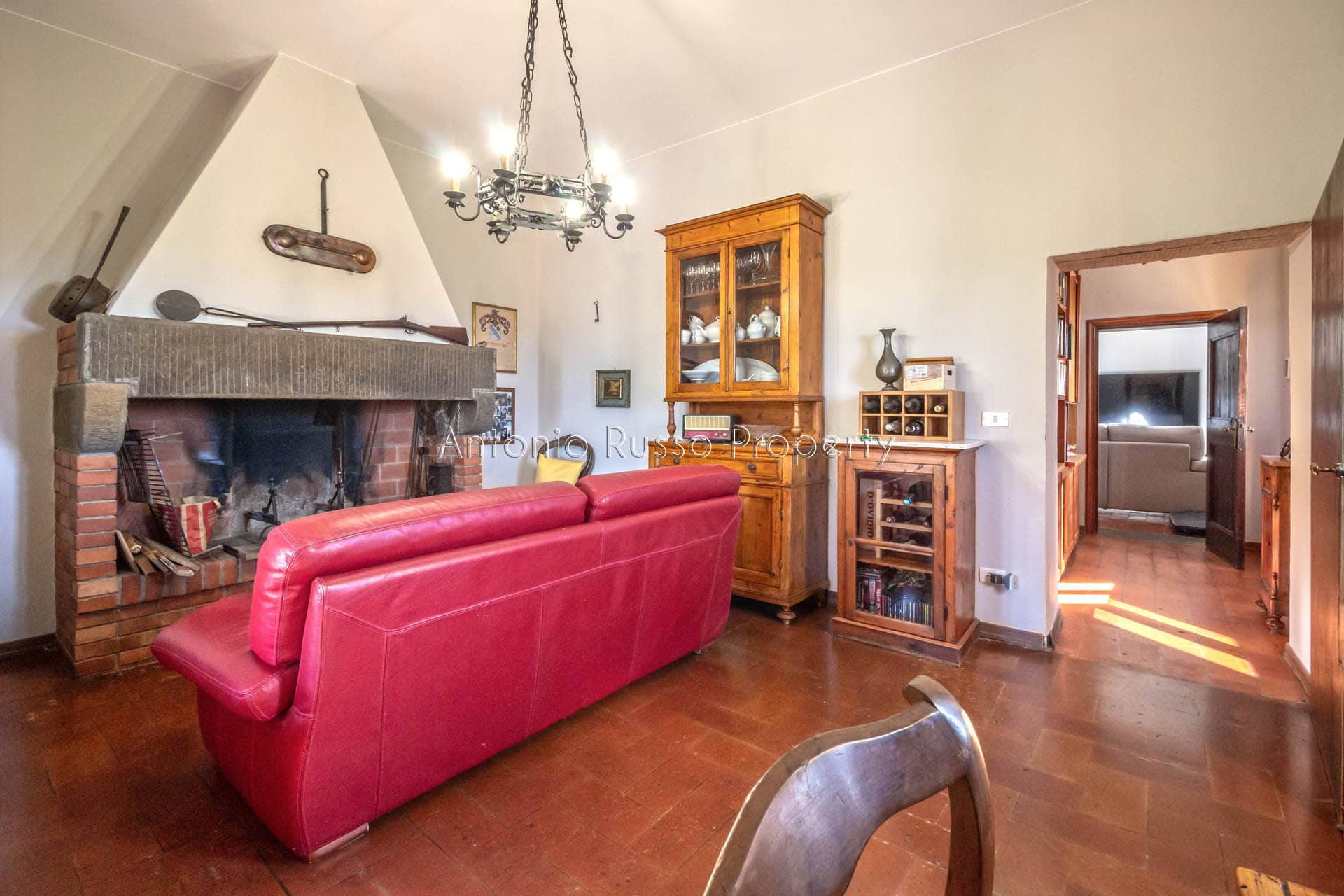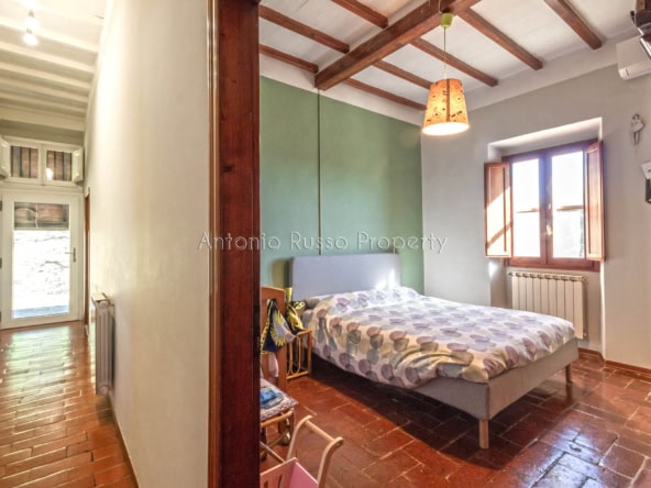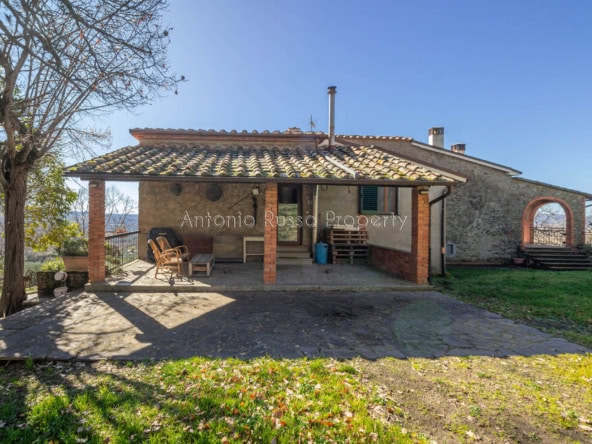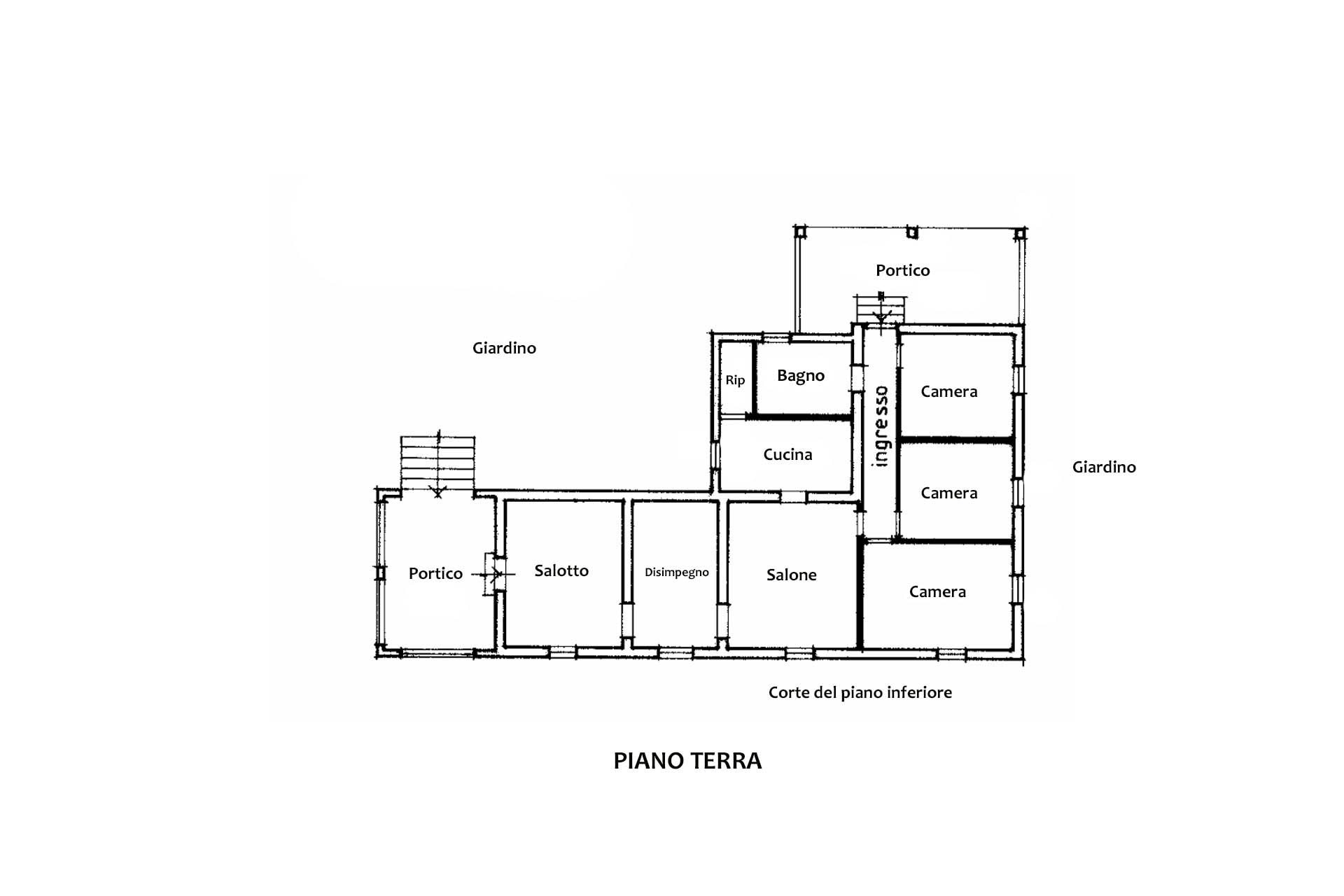 Accesso dal giardino della parte superiore. Presenti due grandi portici: uno perfetto per pranzi e cene all’aperto, l’altro valorizzato da una vista aperta. Distribuzione: ingresso, corridoio, tre camere, cucina, bagno, ripostiglio, disimpegno, sala con camino e salotto.