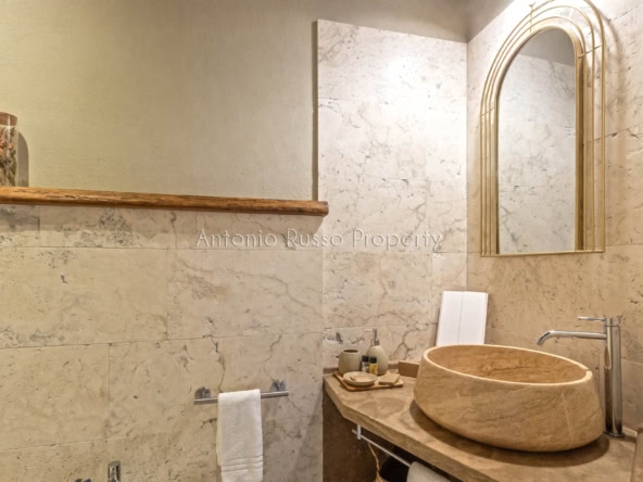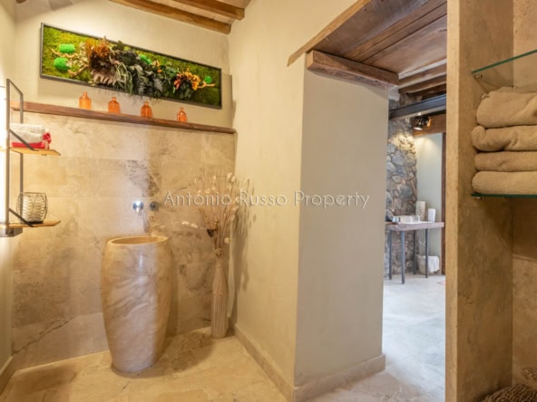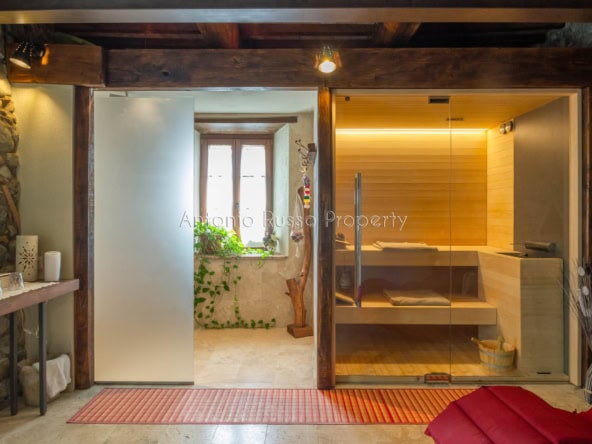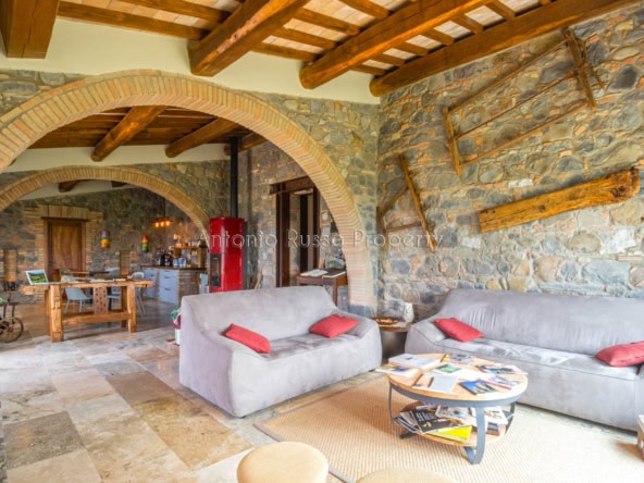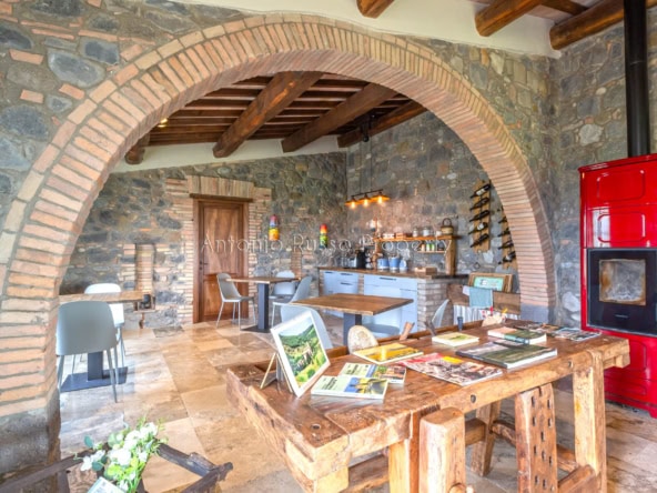 Il restauro ha preservato la sua anima originale: murature in pietra di basalto e mattoni fatti a mano, tetto isolato con coppi antichi, travi e mezzane a vista, pavimenti in travertino e inserti in vetro che rivelano l’impiantito d’epoca.