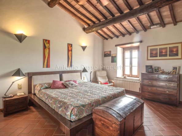 Al primo piano, collegato da una scala esterna con loggiato e da una scala interna a chiocciola, si trova l’appartamento padronale con ampia cucina toscana, salone con camino, camera, studio e bagno. Dalla terrazza panoramica si apre una vista mozzafiato sulla Val d’Orcia.