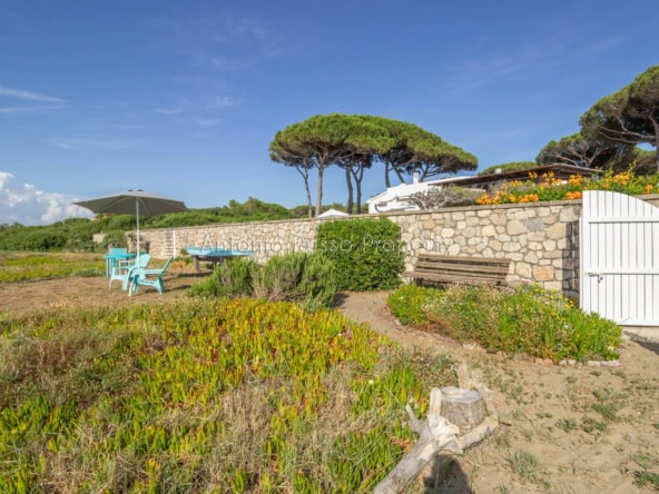 Solo una recinzione separa il giardino dalla spiaggia, dove è prevista un’area riservata per lettini e ombrelloni.