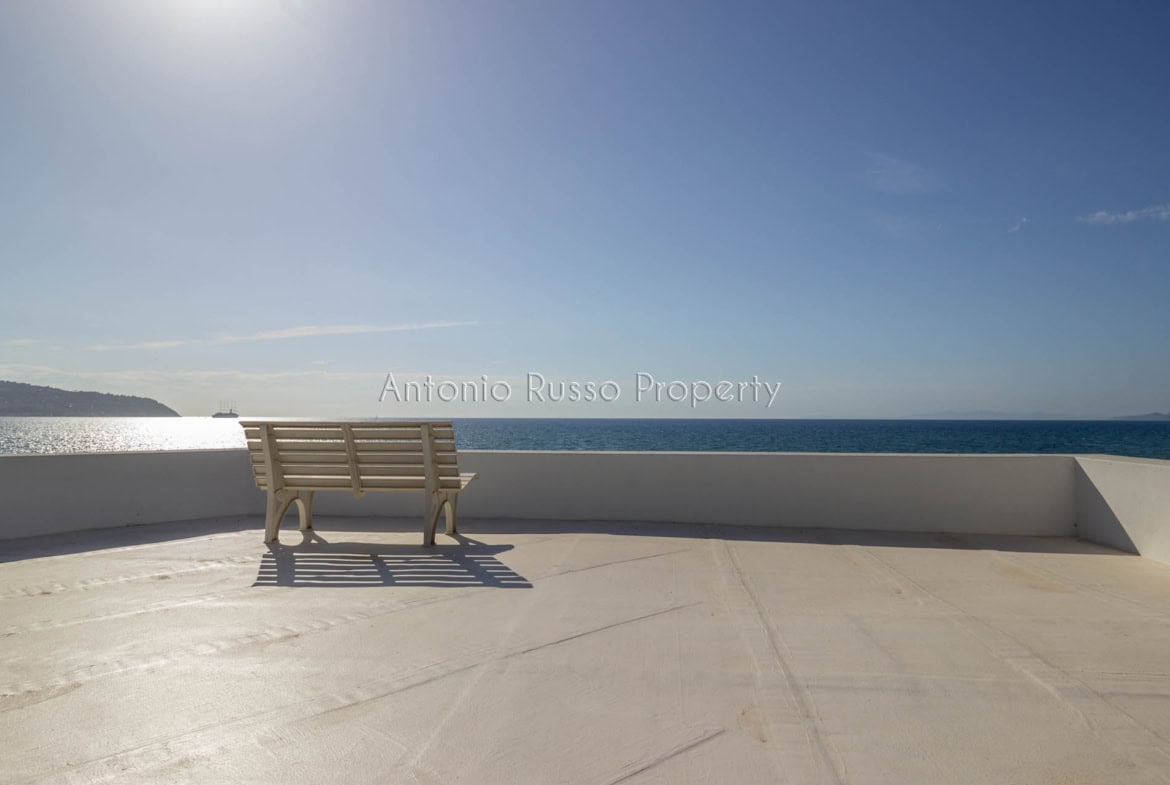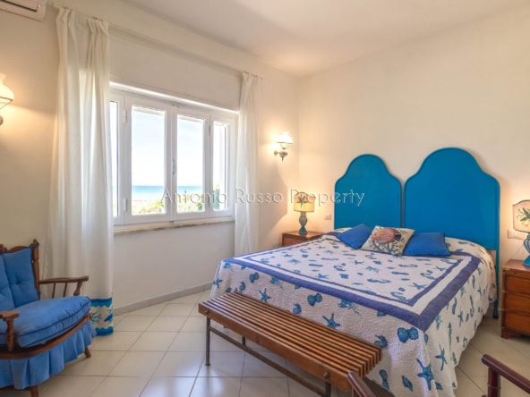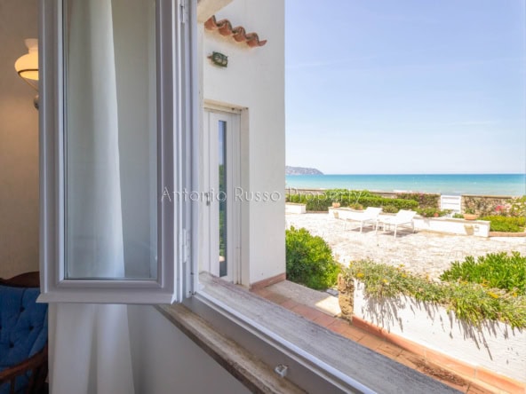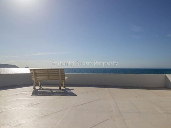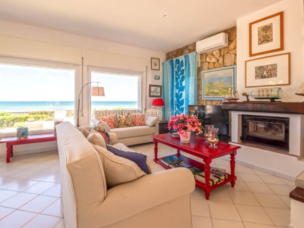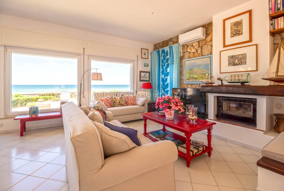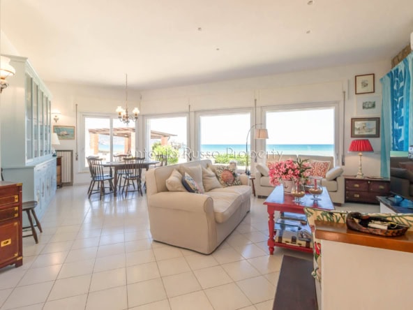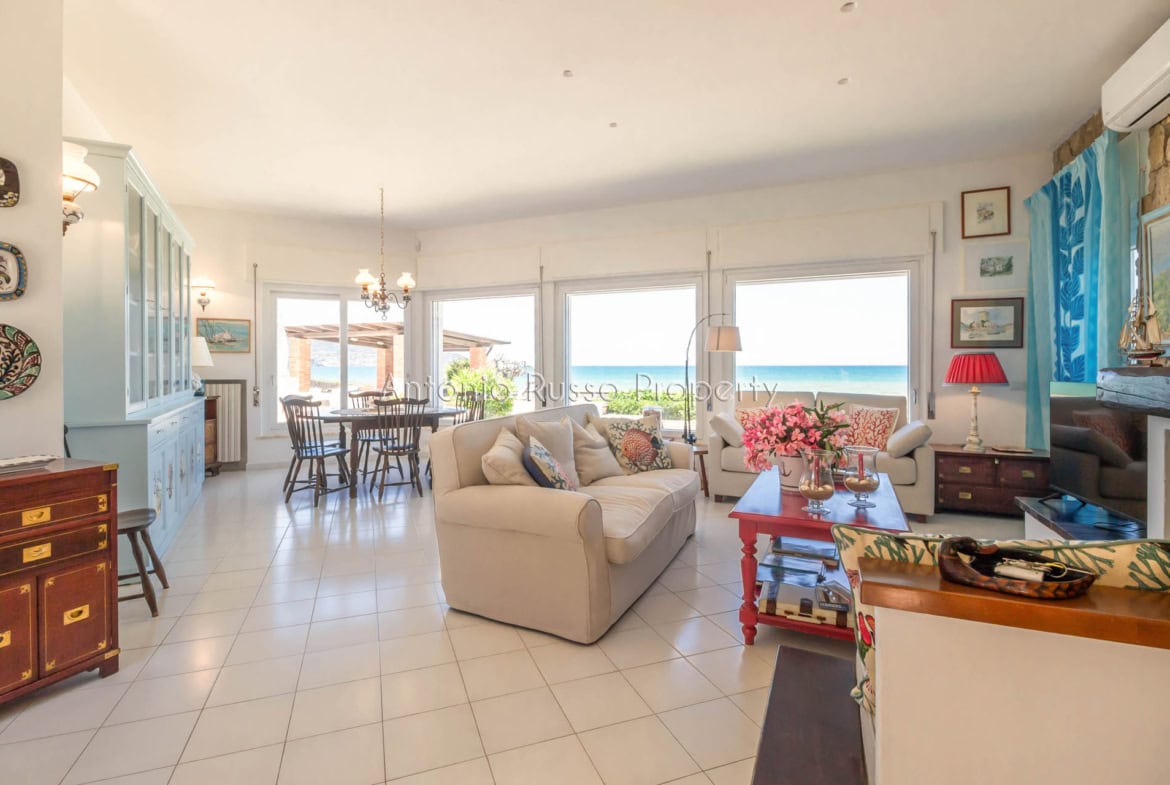Il cuore della proprietà è l’ampia zona living. Le grandi finestre portano luce naturale e mare in primo piano, creando uno spazio perfetto per relax, lettura e momenti in famiglia.